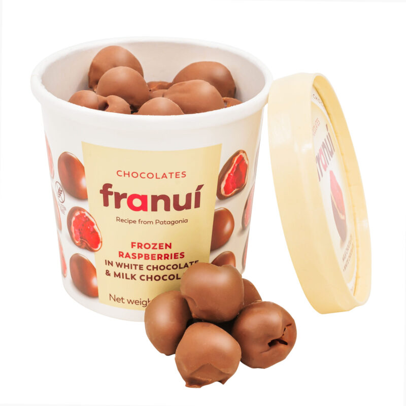 FRANUI Maito- ja valkosuklaalla päällystetyt vadelmat 150g