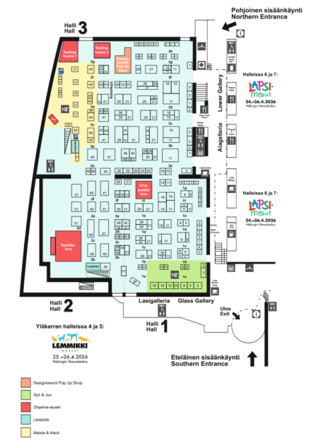 Ruokamessujen kartan avulla suunnistat tapahtumassa helposti! Kartasta näet eri alueet, ohjelmalavojen ja lasipisteiden sijainnit sekä osastojen numerot.